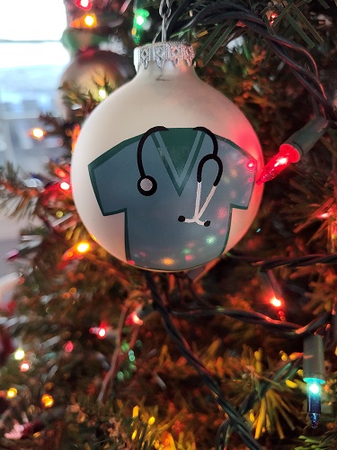 Our tradition was actually started by Sam before we were even dating.  She and I do the same work (sleep technologist) and that’s how we met.  When she graduated from the program, she bought an ornament for her tree. There are no real “sleep tech” ornaments, so she went with one that had scrubs on it.