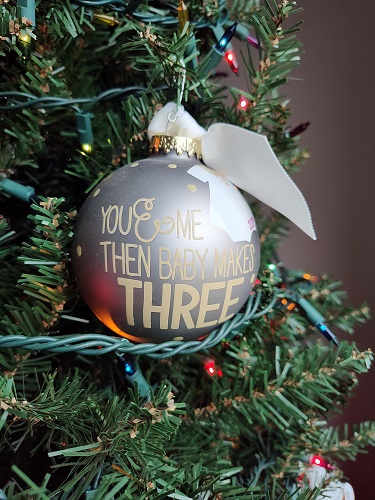In 2019, Sam was expecting. She was 7 months pregnant at Christmas. One of my favorite pictures is of her standing in front of the tree showing her baby bump. I just loved the “You, Me and Then Baby Makes Three” ornament.