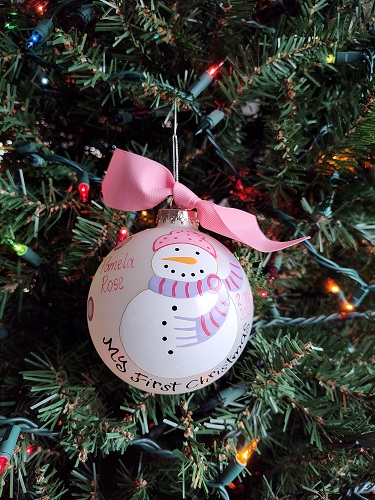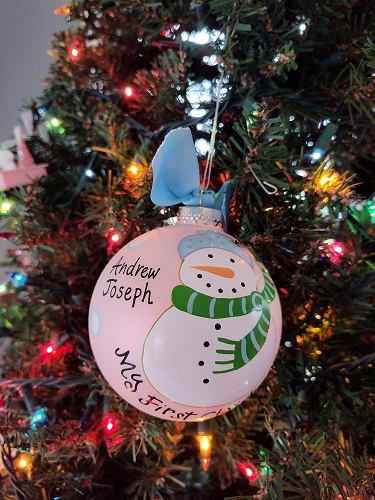 I loved this ornament because they were able to put her name, birthday, weight, etc.. on it. One Christmas later, when Andrew was born, we went back and got the same ornament… In blue.