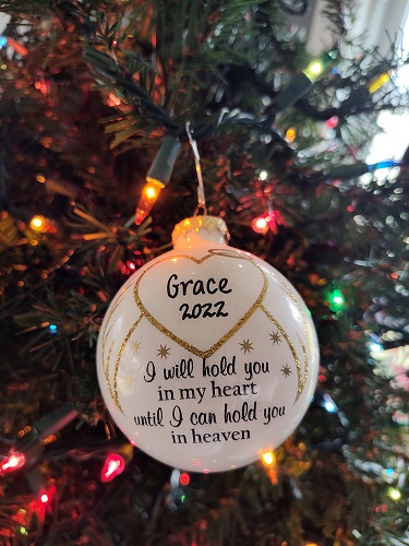 After our trip to Bronner’s, tragedy struck as Sam’s sister Grace passed away. Her presence is missed daily. I decided that I wanted to do something for Sam and her parents. So I went to Bronner’s on my own and had a memorial ornament personalized with Grace’s name for both of them. Ours hangs near the top of the tree.
