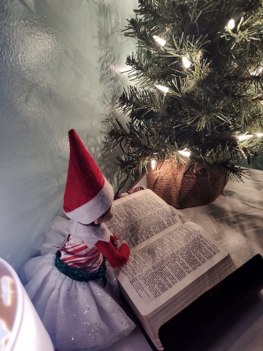 I don’t care if I use this one every year! Here is Twinkles, the elf, reading from the Bible. I said that it ties in with my last bit of news.