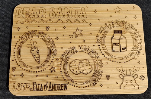 We left later than we expected and got home to get the kids in bed. Before we could do that, we had to leave out cookies and milk for Santa. One of our neighbors (the one who has the box to mail Santa letters – and answer them), messaged me to say that they had something special for Ella and Andrew. I went over Friday and they handed me a beautiful board for Santa’s milk and cookies.