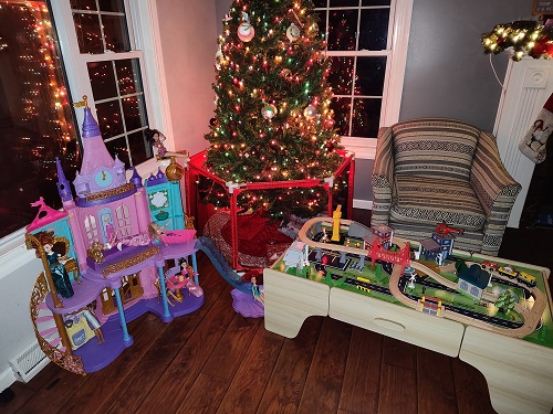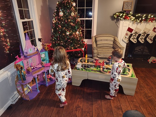 The dog started barking earlier than normal and I was up to let her out. Andrew was up first and he ran to get Ella because Santa had arrived. For one brief space of about an hour, we felt like it was Christmas. The magic of watching them walk out and seeing their toys ready for play! Wow, do I remember that feeling! It is one of the most powerful memories in my life. That initial walk out to the tree … pure magic!