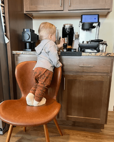 Sam took the dog outside to go to the bathroom. In the 3-4 minutes that she was outside, Andrew was at it again. When she walked in, she saw him on a kitchen chair pushed up to the counter. On the counter, he had taken the piece that holds a coffee filter out and put a filter in it. He then scooped a tremendous amount of coffee into the filter. He had actually turned the pot on to brew. Thankfully, there was no water in it, so he didn’t brew any. Of course, we will be sweeping up coffee grounds from the counter, the floor, and a few other places for the next week!