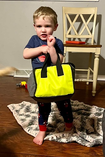 He has a few “tool boxes” but my father-in-law has a tool bag. I guess He was trying to put the cordless drill in his boxes and it won’t fit. So he asked his Pa about a tool bag. You can only imagine his excitement when Sam’s folks dropped by the house the other night with a nice new tool bag for Andrew’s drill and other tools!