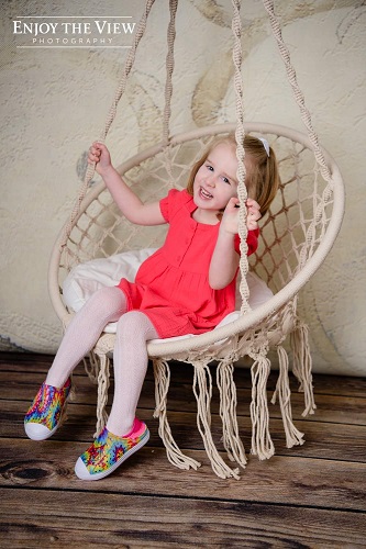 This session truly showed her personality. There were pictures of her making silly faces, laughing out loud, and even sticking her tongue out. I joked that we paid for her to make silly faces, but I love that we have them. It is really what she is like right now – silly and sassy. At the end of her session, they had her sit on a swing. There were some fantastic photos there. This one is one of my favorites: