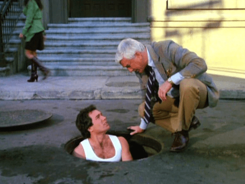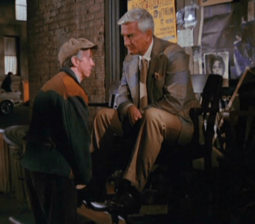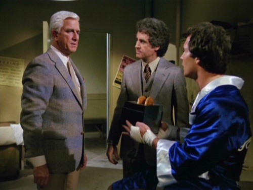 Enter Leslie Neilsen as Frank Drebin. He arrives on the scene and is filled in by his boss as to what happened. He is told that they are currently “dusting for prints” and upon entering you see a French maid with a duster (one of many sight gags.) The police captain asks Frank to go under cover because there is talk that the fights are being fixed.