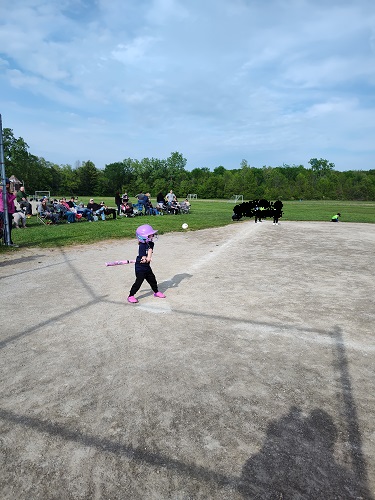 Every kid gets to go to first base and advance a base with each batter. When the team’s last batter comes up and hits, everyone runs home.