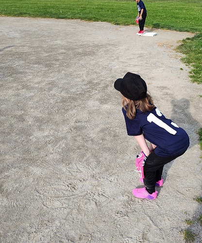 Out in the field, it get’s tougher to keep them focused. There really is no outfield, because no one really hits the ball far. So everyone sort of hangs in the infield. Ella was between 1st and 2nd base when she was out in the field for this game.