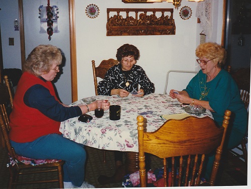 This is my mom, my grandma, and my great Aunt Rose waiting for me to sit back down to play one of MANY hands of Pinochle. I miss those games more than I can express. So much fun.