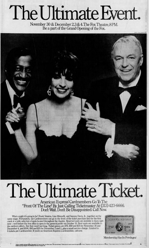 Toward the end of his career, he would take the stage at another theater. Sammy was there for the rebirth of the Fox Theater, along with Frank Sinatra and Liza Minelli.