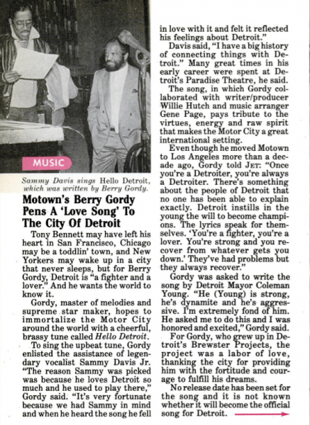 Yesterday, the City of Detroit celebrated its 323rd birthday! Back in 1984, Detroit’s Mayor (Coleman Young) reached out to Berry Gordy Jr. of Motown Records to write an anthem for the city. Berry wrote “Hello, Detroit” with Sammy Davis Jr. in mind to record it. When he showed Sammy the song, Gordy says that he “fell in love with it and felt it reflected his feelings on Detroit.”