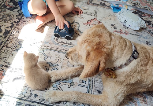 Maizey isn’t quite sure how to take the kitty yet, but they seem to get a long. Daisy won’t leave the kitten alone! She’s always right by her.