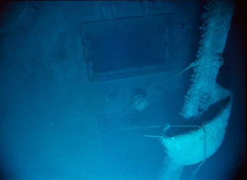 This mundane-looking photo of what turned out to be one of the ship’s boilers is what the crew first noticed. Excitement over the discovery among the crew and scientists was tempered by the knowledge that they floated above the final resting place of more than 1,500 people who were lost at sea 73 years earlier. (Photo ©Woods Hole Oceanographic Institution)