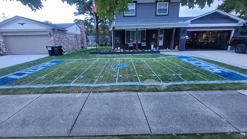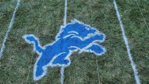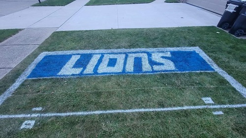 Some fans are showing their love for the team in unique ways.  Metro Detroiters Jared Blair and Brad Smith, for example,  transformed this Woodhaven, MI front lawn into a 1/10th replica of the Detroit Lions’ field at Ford Field.