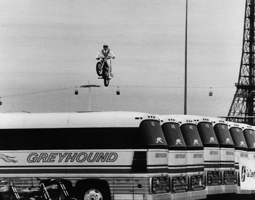 He was THE Daredevil… There are Daredevils around today but no one has reached the popularity that Knievel achieved. Not only did he jump and crash he looked cool jumping and crashing. He was like a cool Elvis in a jumpsuit jumping various objects.