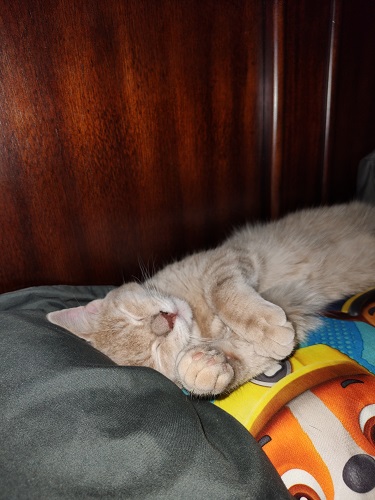 Last night, I went to turn onto my other side when I came face to face with someone sharing my pillow.  My son was next to me and it is obvious that Bitsy found a way to make his pillow a bed!