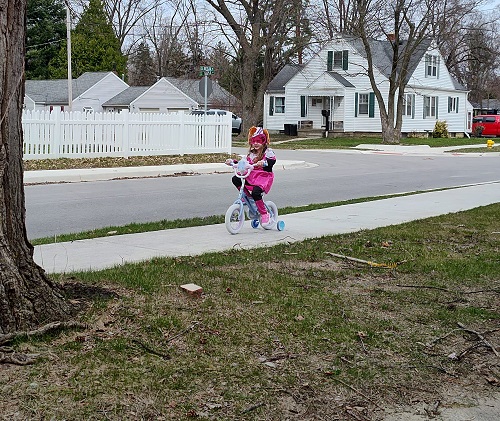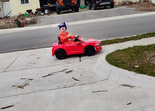 Before they went out, they had been playing in the “dress-up” bin. Ella was in her Skye from Paw Patrol outfit, while Andrew was Cat Boy from PJ Masks. They wanted to go out and ride their bikes, scooters and electric car. They didn’t even take off their outfits. Instead, they played out in the front of the house in them. One can only imagine what folks thought as they drove by.