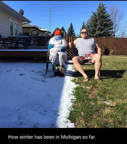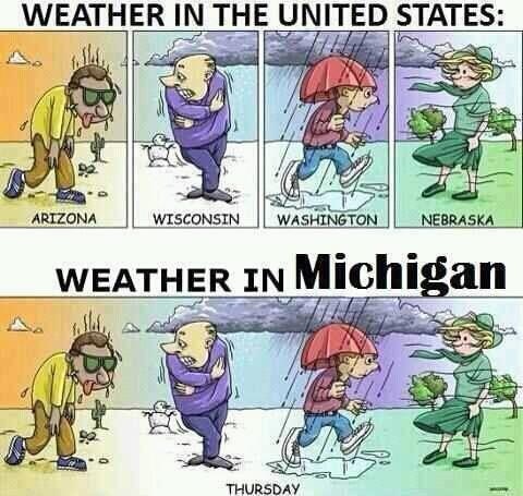 I suppose every state (or country for that matter) has their own weather quirks. Here in Michigan, the weather is a subject of humor almost daily. There is a plethora of funny cartoons/memes about that very subject. Here are a few of my favorites: