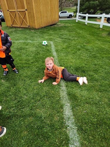 He was so excited that I was going to be coaching his team. There was another dad who volunteered, too. Neither of us know what we’re doing but we tried to keep it fun. We played red light green light (they kick the ball around fast/slow/stop), Simon says (Put your knee on the ball, kick a goal, etc…), soccer bowling (the have to knock down the cones with the ball), and “Ouch” (The kids job was to kick the ball at the coaches and when we got hit, we had to say “Ouch”).