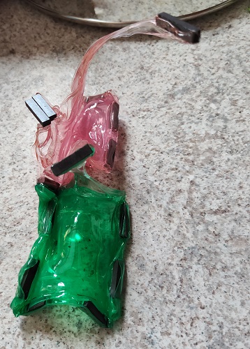 Thank goodness the magnets, when it melted, stuck to the rack of the oven. Apparently, Andrew put the tiles in the drawer and when we put the tin away, didn’t see them. They were stuck to the bottom of the tin.