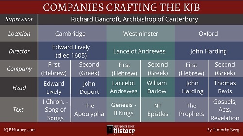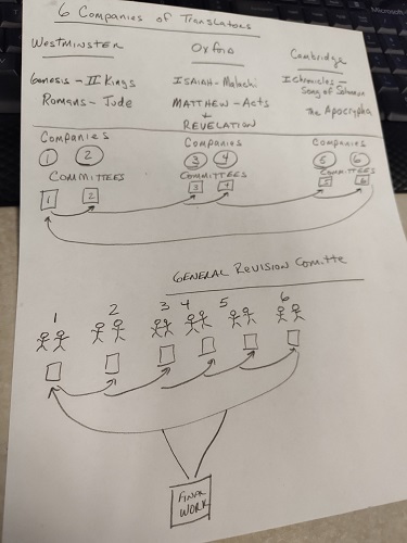 The process was a thorough one. These 47 men were organized into six Companies, two Companies at Cambridge, two Companies at Oxford and two Companies at Westminster. Each Company was given a portion of the scripture to translate. (Westminster was given Genesis – II Kings and Romans – Jude. Oxford was given Isaiah – Malachi, Matthew – Acts, and Revelation. Cambridge was given I Chronicles – Song of Solomon and the Apocrypha.)