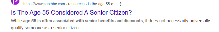 Keith R is right. I know what you mean on some of that. As a kid we were always told 65 was the line for a ‘senior citizen’ but now 55 is often used as a guideline. The retailer I last worked for in Canada had established that anyone 55 plus could get some of their perks, though it was also a sort of ‘only if they ask or say they are’… you don’t want to offend say, a 49 year old by saying ‘you look at least 55…’. Yet oddly, people at 55 now tend to be in much better shape and health than people of the previous generation were. In short, don’t fret too much about it!