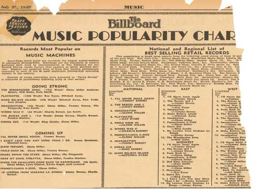 The first Billboard singles chart was published on this day in 1940. It was 85 years ago that Billboard began compiling and publishing the National Best Selling Retail Records chart. It became the first official national music chart. Wiki says: Debuting in the issue dated July 27, it marked the beginning of the magazine’s nationwide tracking of record sales in the United States. Initially titled the “National List of Best Selling Retail Records”, the weekly ten-position chart was tabulated using sales figures received from a selection of merchants across the country. Prior to its introduction, The Billboard had produced lists ranking music by various metrics such as performance in vaudeville venues, jukebox plays, sheet music sales, and regional airplay.
