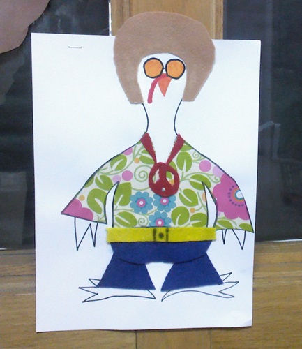 Two years later, my second son had the same project. We asked him what he wanted to do with his turkey. He wondered if it could be a dancer. So, we made him a disco dancing turkey. we were able to use some of the left over felt from the previous project, and bought a couple colors for hair and pants.