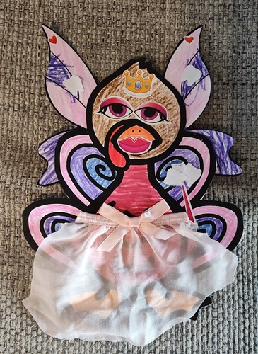 Then she changed her mind. She wanted the turkey to be disguised as the Tooth Fairy. We found an old tutu, some stickers for the eyes and mouth, made a wand with teeth on the end of it, and ta da – the Tooth Fairy.