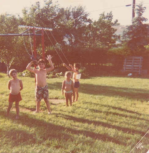 The above photo was taken in August of 1979. From left to right, you have my brother, me, and our friends Nicole and Jim. It looks as though we were ready to go swimming, but we didn’t have a pool. Perhaps we were running through the sprinkler or something.