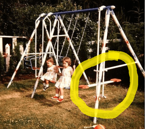 It was set up just like the photo above. Except in the place of one of the swings, we had one of those two seat swings. You know, the one that kind of looked like a see saw? It took me forever to find the thing on the internet because I didn’t even know what to call it. However, you can see the thing in this picture: