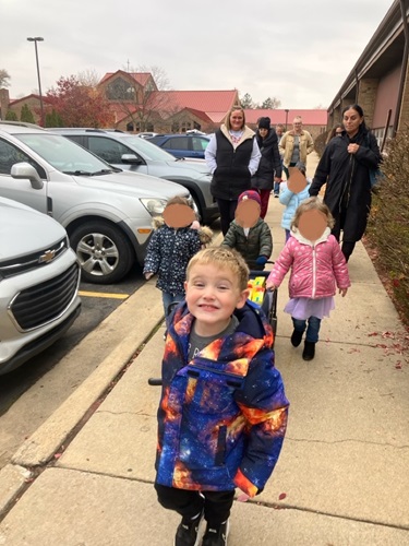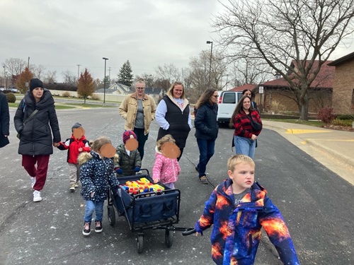 My son’s preschool class (and some other classes, too) were collecting items at the beginning of the month for a local food pantry. I think they collected over 350 pounds of food for the pantry. Last week, they put all of the items in wagons and had a little parade over to the pantry to deliver the food.