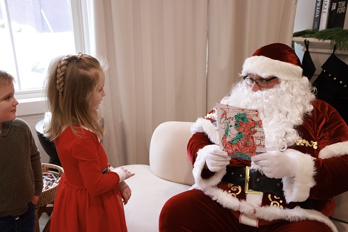 We were greeted by a large elf. He showed around and then we got photos done. Ella had drawn a picture for him. He was thrilled to get it. My coworker said he brought it home