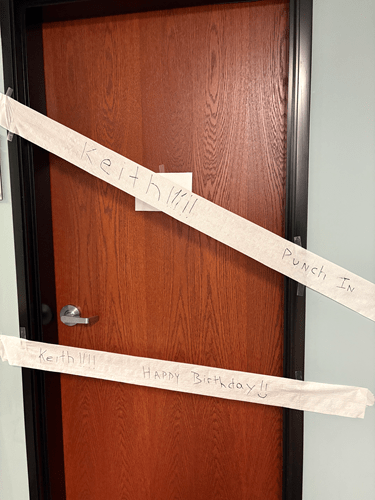 Since then, we’ve all played a joke or two on each other. One time I wrapped a coworker’s chair in toilet paper. Another time a coworker had wrapped my supply box in plastic wrap and rubber bands. One coworker had taken the label maker and labeled all of my stuff (Keith’s Mug, Keith’s Chair, Keith’s Post-It Notes, etc…).