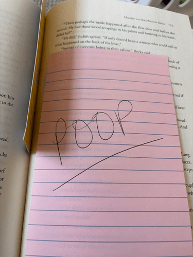 This was strategically placed right where my book mark was. What made this joke even funnier was that more of these would pop up throughout the rest of the book. Before I returned it to the library, I flipped through it and found even more in the beginning of the book. I can’t imagine what the next read would have thought if they found this inside the book.
