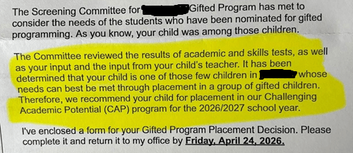 Recently, they pulled her from her class to do some testing. I had no doubt that she would do well on those tests. My wife and I both shed tears when we opened up the letter from her district: