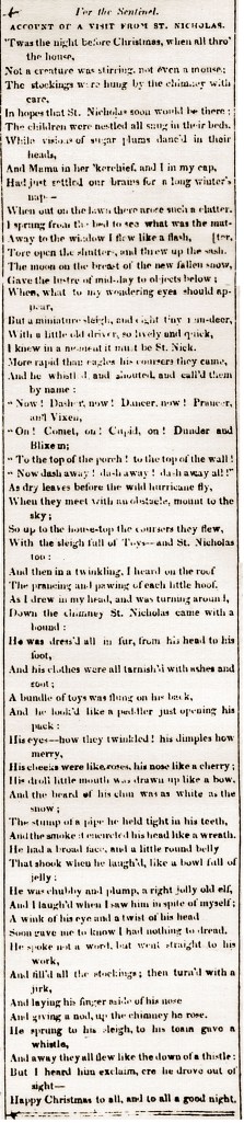 On this day in 1823 the poem A Visit from St. Nicholas was first published in the Troy Sentinel. It has also been called “Twas the Night Before Christmas” because of the first line in the poem. When first published, the writer remained anonymous. Authorship has been attributed to Clement Clarke Moore, who claimed to have written in in 1837; but it has also been suggested that Henry Livingstone Jr. wrote it. The claim for authorship is still questioned.