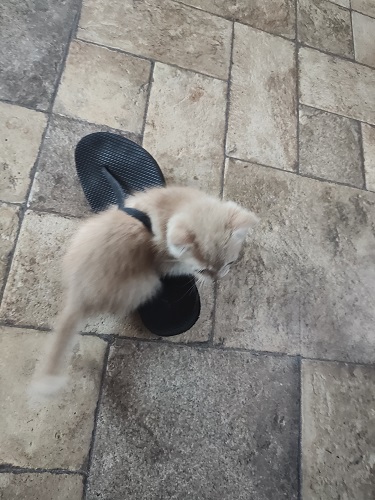 Watching her this week has only enforced the phrase, “Playful as a kitten.” She loves to play. We definitely have to get her a few more kitty toys. Until the, I guess she will continue to wrestle with Sam’s Flip Flops.