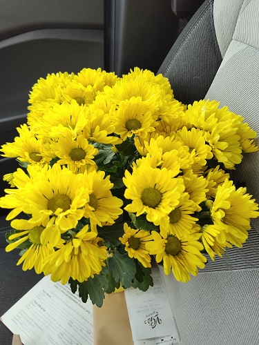 We told each of them that they could pick five things for her. When we walked into the store, they were off. They did a great job. They got her a calendar, new pens, a pumpkin solar light, plastic cups with their favorite things on them (Disney Princesses and Paw Patrol), nail polish, and a couple fall figurines. They also made sure to get her some pretty flowers.