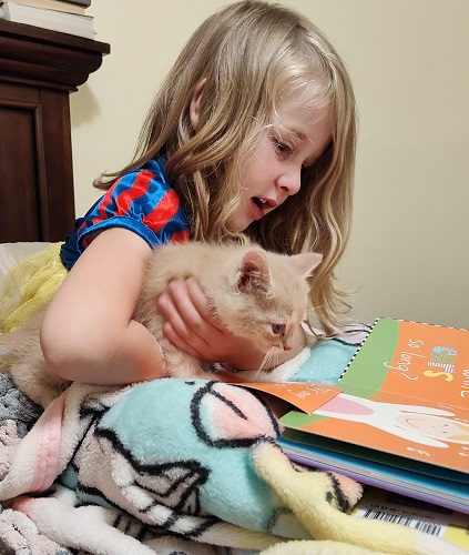 Bedtime at our house always seems to be crazy. It got a little crazier this week when I walked into the bedroom with books to read, only to find that Ella was already reading … to our kitten!