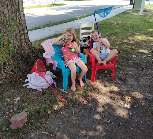 They must have been hot, to, because they were a bit more stationary than usual. They grabbed four of their chairs and put two in front and two in back. Next thing I know, they were “driving” to the store, to the park, and to go get ice cream. Naturally, they had to have their butterfly nets with them…