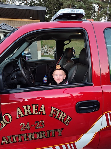 Andrew was dressed as a firefighter. When he walked up to one of our local guys, he placed a handful of candy in his bucket. Then he reached in and put another handful in because they were now “brothers!” Ella got two handfuls, too because she was with him.