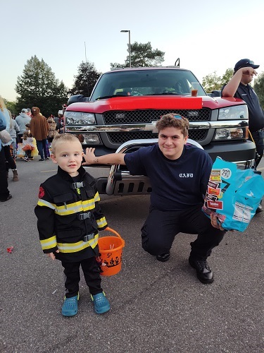 They also had cider and doughnuts from one of the local orchards and the kids loved that. They had the parking lot lined up with cars that were decorated for the event. It took us about 40 minutes in line before it was our turn to actually “trunk or treat.” The first vehicle was one of the local fire trucks. Boy, did Andrew and Ella luck out!