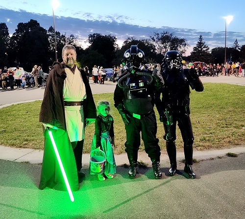 Some of the cars were really done up nice. There was one that was done up in a Star Wars Theme. They had a mechanical Yoda, R2-D2, and some folks dressed up. Andrew was a bit scared of the Stormtroopers, but Ella had to have a picture with “the man with the green light sword!”