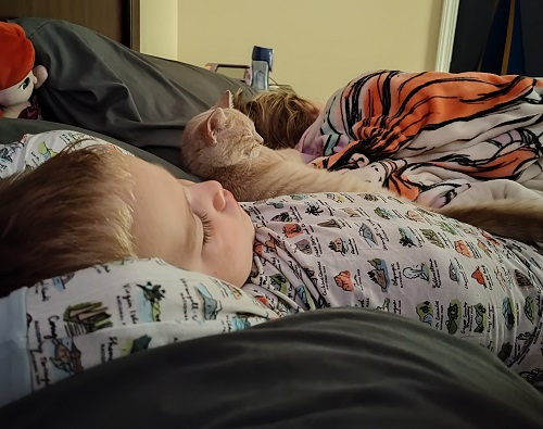 Sunday night, I got the kids to bed early. The school break was over and it was back into our routine Monday morning. Everyone decided to crash in our bed that night. I guess I woke up about midnight and as I changed positions in bed, I had to laugh. Andrew was next to me, Ella was in Sam’s spot and smack dab in the middle of them was our kitten, Bitsy!
