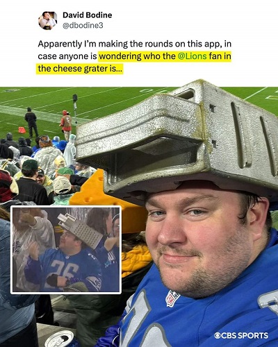 During the broadcast, they cut to a Lions fan who was wearing a cheese grater hat. For those who don’t know, the Packer fans are often called Cheese Heads and wear Cheese hats. I love this guy for wearing this and going viral on the internet! He had no idea until after the game, obviously, because he posted this: