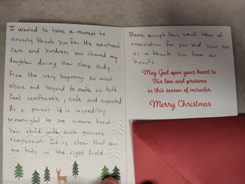“I wanted to take a moment to sincerely thank you for the exceptional care and kindness you showed my daughter during her sleep study. From the very beginning you went above and beyond to make us feel comfortable, safe and supported. As a parent it is incredibly meaningful to see someone treat your child with such genuine compassion. It is clear that you are truly in the right field. Please accept this small token of appreciation for your and your son as a thank you from our hearts.”