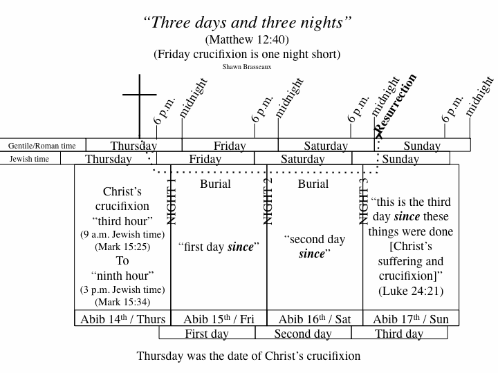 Another way to look at it is like this: Jesus Christ died around 3 p.m. (“the ninth hour;” Matthew 27:46,50; Mark 15:34,37; Luke 23:44-46). The Jews count days from evening to evening (6 p.m. to 6 p.m.), rather than the Roman/Gentile reckoning of time (midnight to midnight). The only way for Jesus to be dead three days and three nights and resurrect on “the third day” (1 Corinthians 15:3-4), Sunday, is to be crucified on Thursday. Thursday is the most plausible day of His crucifixion—a Friday crucifixion would be only two nights to Sunday, not three nights, and this would not fulfill the prophecy of Matthew 12:40. Furthermore, if we consider Jewish reckoning of time, Thursday evening and Friday morning were the first day, Friday evening and Saturday morning were the second day, and Saturday evening and Sunday morning were the third day, and Jesus rose Sunday morning. Three days and three nights from Sunday would be Thursday, and Sunday could only be the “third day” if it was a Thursday crucifixion. See diagram: