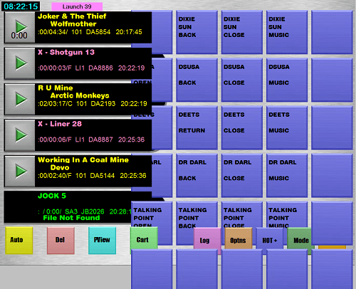 I loved this studio. There was one thing that I hated, and they eventually fixed. Under the microphone you see a cabinet with some knobs on the right. You can’t see it, but inside there was our main computer that ran all the music. It was a touch screen. On that screen, you would see the songs coming up, commercials and a set of “hot keys” on the right for things you use on a regular basis. It sort of looked like: